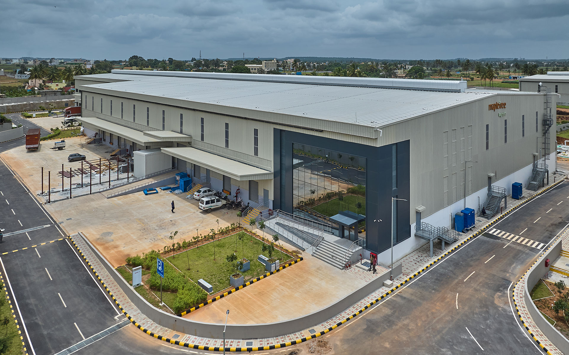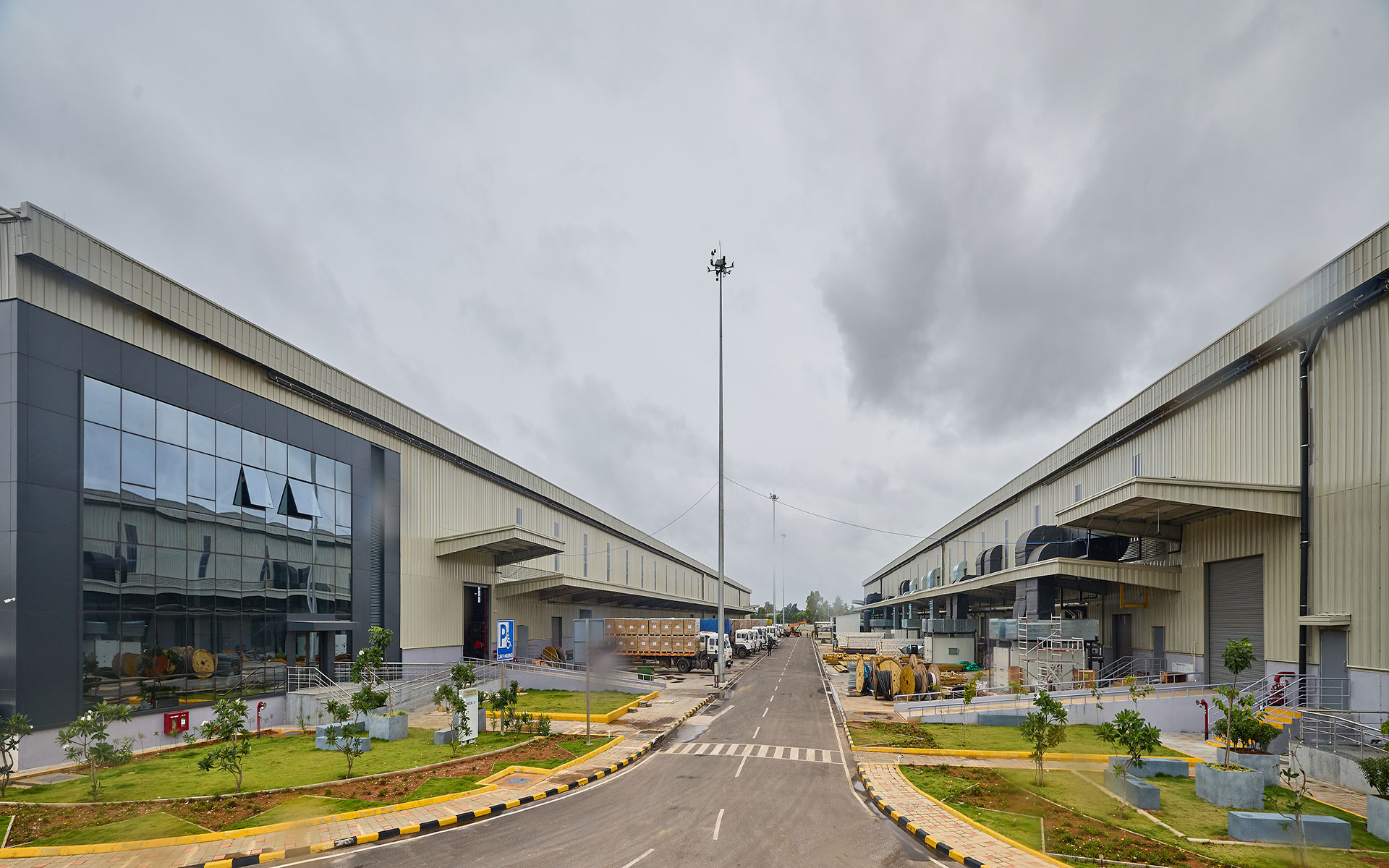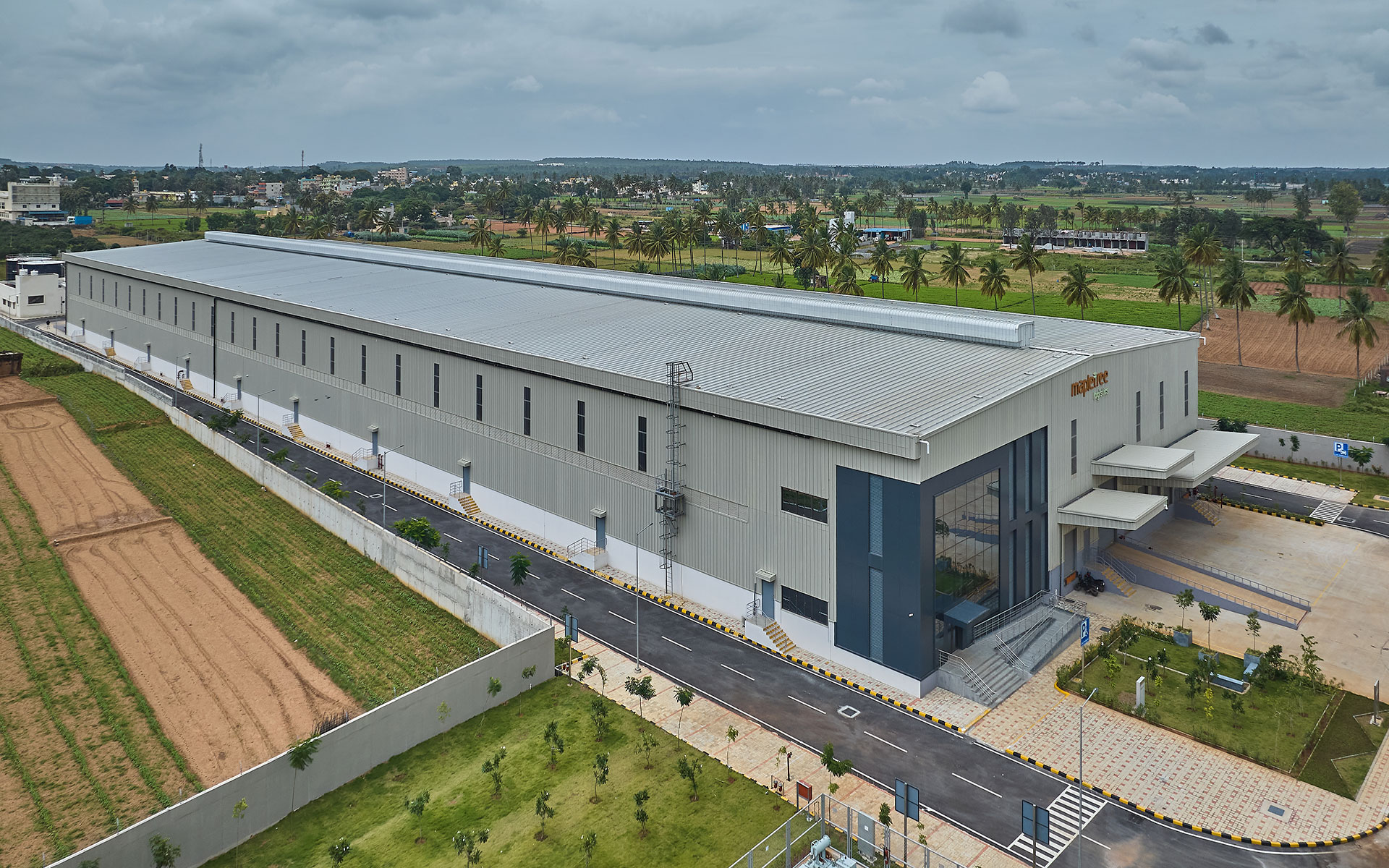 Located in a suburban context along NH648 as a part of rural Bangalore ,the 50acre site is wrapped by a nala on the west and the main access road on the south. A combination of 6 warehouse blocks and an admin block is strategically worked out to maximise the plot coverage while retaining pockets of landscape. A simple steel construction gable shaped roof with a cantilevering canopy for the platform was chosen as a logical and economical solution for the organization of space.